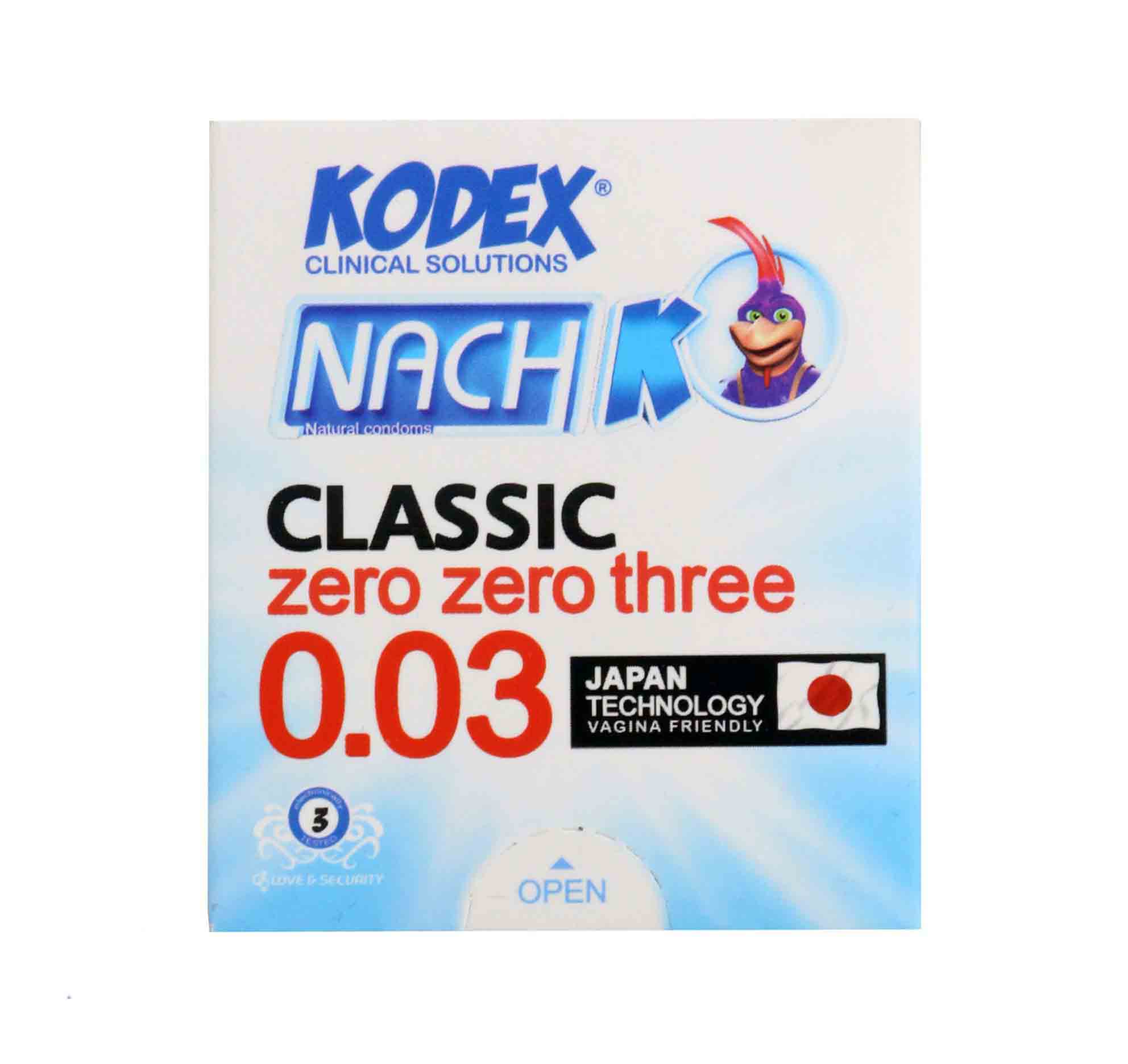 کاندوم کدکس ناچ کلاسیک صفر صفر سه با قطر ۳۰میکرون به عنوان نازک ترین و مقاوم ترین کاندوم لاتکس مردانه در جهان طراحی شده است. این کاندوم حاوی مخزن نگهدارنده است که از بارداری ناخواسته جلوگیری می کند.